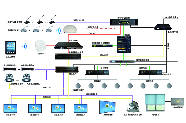 數字會議系統包括智能中央矩陣控制系統、無線觸摸控制系統、數字會議系統、音頻擴音系統、自動跟蹤攝像系統、大屏幕顯示系統以及網絡視頻會議系統、智能照明控制系統等。