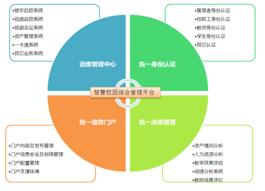 信息化管理平臺對各子系統(tǒng)資源的整合、優(yōu)化、分析并對校園組織和業(yè)務(wù)流程進行再造,推進校園制度創(chuàng)新、管理創(chuàng)新和服務(wù)創(chuàng)新,實現(xiàn)教育管理的信息化、決策的科學(xué)化、管理的規(guī)范化。