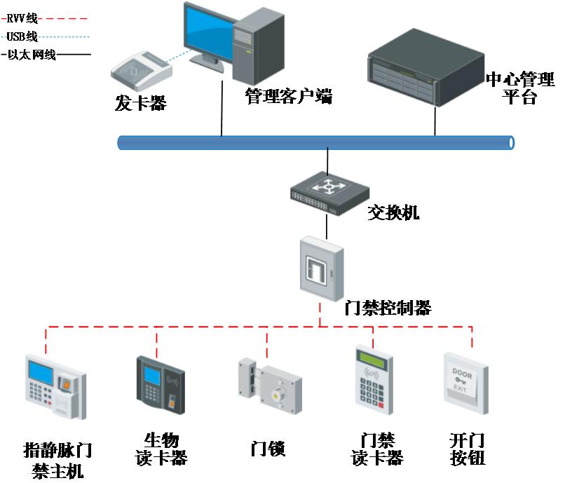 門禁讀卡器、生物識別讀卡器、開門按鈕、磁力鎖等前端門禁設(shè)備通過RVV4*0.75/ RVV2*0.75線纜接入到網(wǎng)絡(luò)門禁控制器上,而網(wǎng)絡(luò)門禁控制器通過非屏蔽雙絞線接入交換機經(jīng)局域網(wǎng)集成到安防綜合管理平臺上。